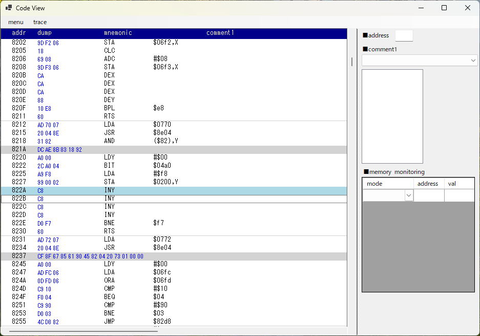 The software also displays MOS6502 programs in disassembled form, allowing you to stop them at any point and check the values of memory, registers, etc. while stepping through the program.