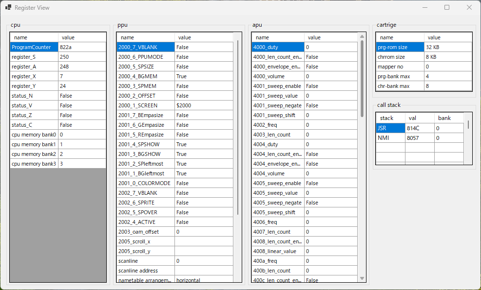 All processing (MOS6502, PPU, APU) is coded in VisualStadio’s c# language and .net, making it easy to understand the internal processing of the hardware.